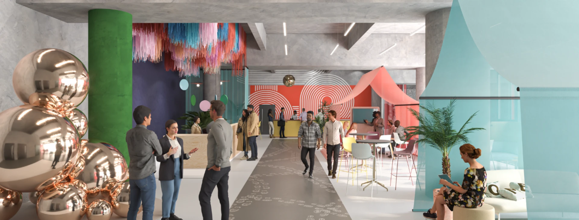 • Visualisierung eines modernen Gebäudekomplexes in einer Stadt bei Nacht, mit beleuchteten Terrassen und einer Ankündigung der Eröffnung am 9. April 2025.