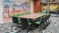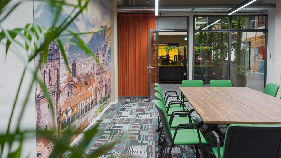 Our room Cusco takes you directly into the heart of Inca culture. On 44 square meters, you experience Peruvian history up close: calming colors and a wallpaper of the Plaza Mayor de Cusco create an inspiring atmosphere. The floor-to-ceiling windows with views of the Amazon and orange net curtains provide the perfect setting for creative meetings and workshops.