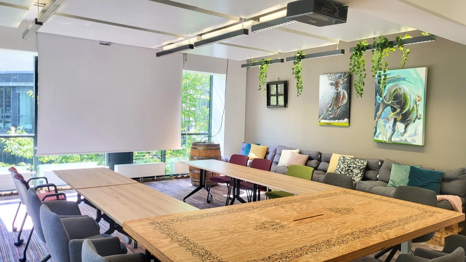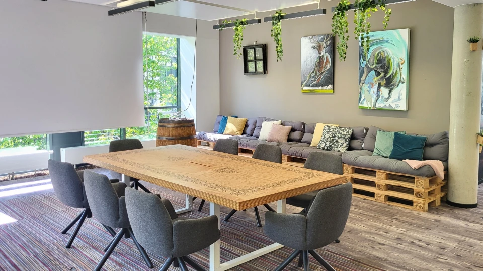 Laptop and leather pants welcome! But no proplem, you're welcome to enter the "Almhütte" without leather pants too, because alongside the Alm-Stammtisch corner, the cozy decor with lots of wood and special details ensures genuine Bavarian flair. From a traditional Bavarian breakfast with white sausages to a packed workshop day: the open, relaxed atmosphere invites creative work in the best Bavarian setting. You can create work islands, retreat areas, or networking spots here, as the "Almhütte" can be adapted and used flexibly according to your preferences.