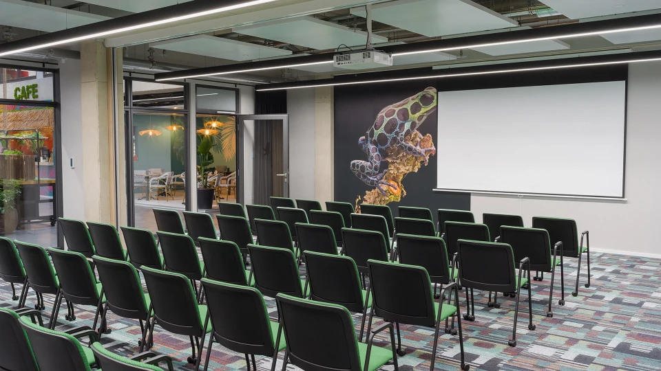 Lima bietet eine faszinierende Kombination aus Natur und Moderne, die sich perfekt in den 44 m² großen Raum widerspiegelt. Mit der beeindruckenden Tapete des Ranitomeya variabilis Giant Frosches schafft dieser Raum eine inspirierende Atmosphäre. Nutze die perfekte Balance zwischen einem produktiven Arbeitsumfeld und der beruhigenden Präsenz der Natur, um Deinen nächsten Workshop unvergesslich zu machen. Entfernt man die Trennwand, so entsteht in Kombination mit Cusco der große Raum Peru.