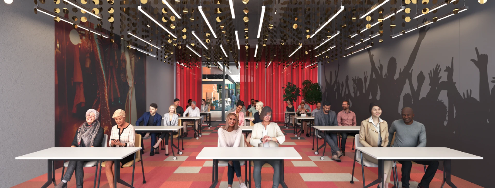 • Visualisierung eines modernen Gebäudekomplexes in einer Stadt bei Nacht, mit beleuchteten Terrassen und einer Ankündigung der Eröffnung am 9. April 2025.