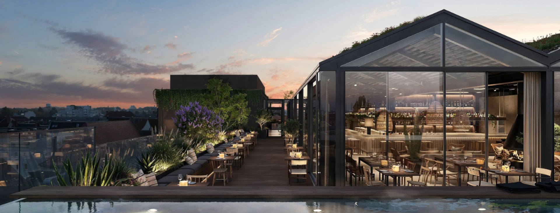 • Stilvolles Rooftop-Restaurant 'KALLE Grill' mit verglasten Pavillons und urbanem Garten, beleuchtet in der Abenddämmerung. Gäste genießen die Atmosphäre mit Blick auf die Skyline der Stadt, während das moderne Design mit grünen Elementen harmoniert