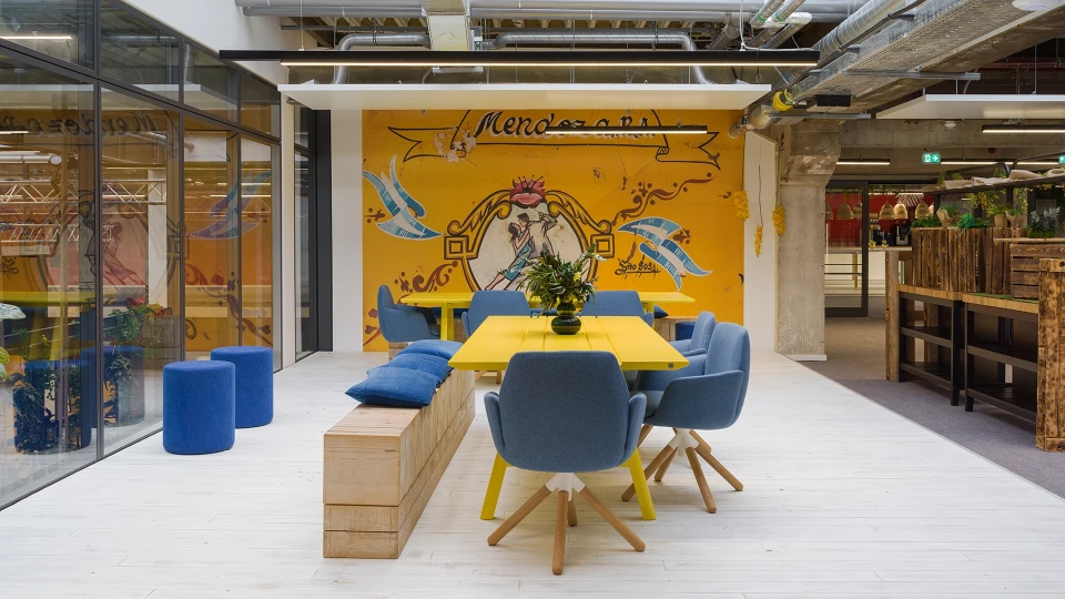Argentina - tango, asado and innovation The 353m² room (430m² with 3 breakouts) on the second floor impresses with its unusual street art wallpaper featuring a dancing tango couple. The floor-to-ceiling window front with a view of the Amazon, the lounge area with self-service counter and the three breakout rooms (Rosario, Misiones, Buenos Aires) offer flexible event options for up to 120 people.