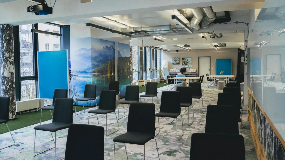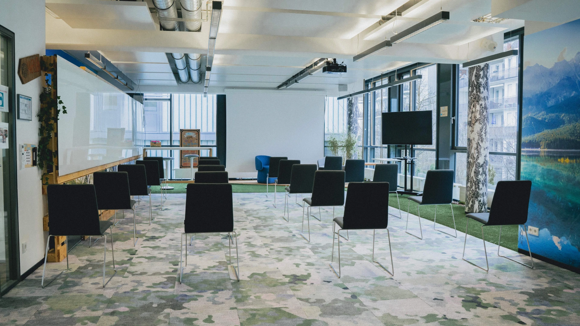 If you've ever been to the Zugspitze, you know what freedom feels like. Combine that with the Alpspitze, and our "Wetterstein" room becomes unbeatable: boasting 166 m², it offers ample space for workshops and meetings for larger teams. Whether you prefer a long table setup or diverse work islands, you and your team have the freedom to customize this space according to your needs. Thanks to the mobile partition, it's even possible to separate individual workgroups for uninterrupted focus.