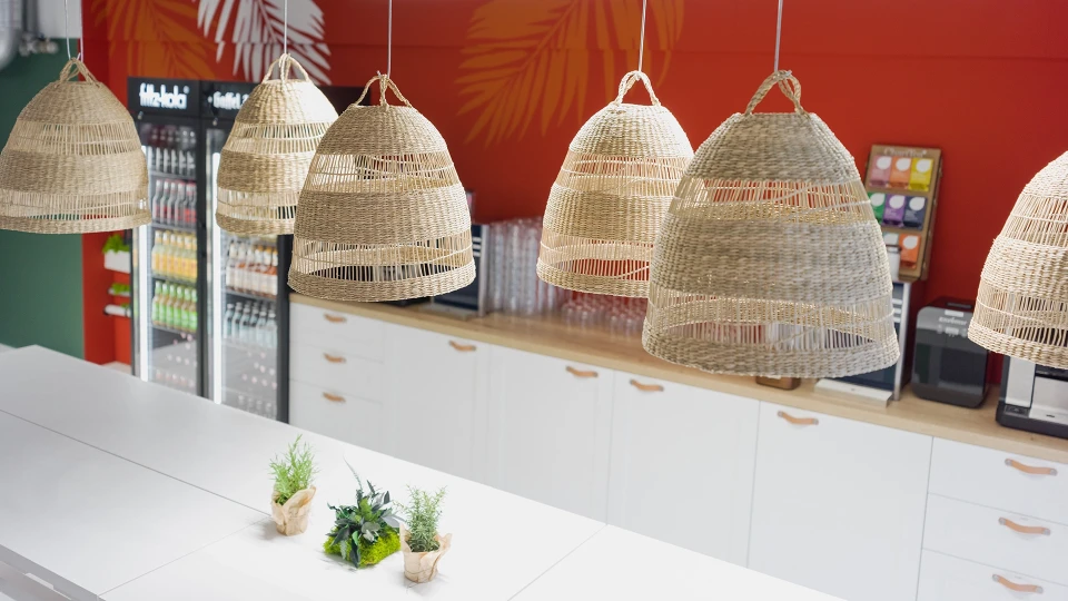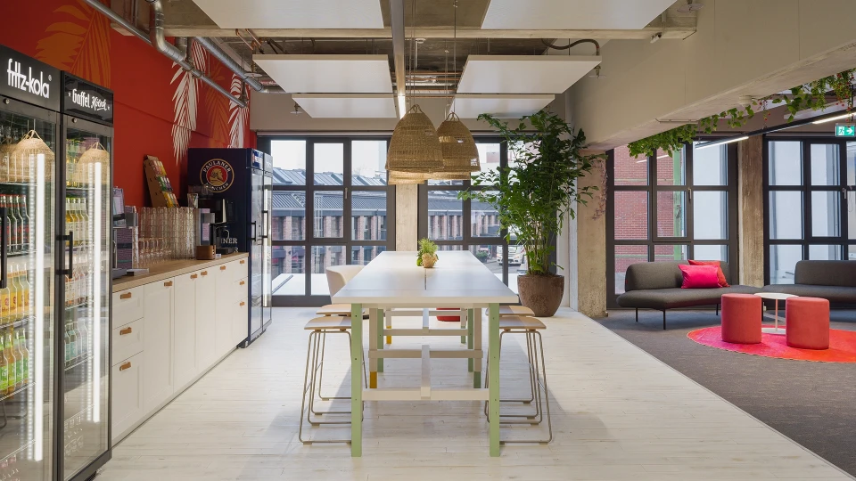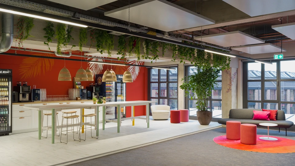 Beach Bar - Deine tropische Auszeit Strategisch neben Costa Rica gelegen, empfängt Dich die Beach Bar mit ihrer einzigartigen Mischung aus Urlaubsflair und modernem Arbeitsambiente. Die markante korallenrote Wand mit künstlerischen Palmenmotiven und die von der Decke hängenden üppigen Grünpflanzen schaffen eine entspannte Atmosphäre für Deine kreativen Meetings und Get-togethers. Mit einer vollausgestatteten Selbstbedienungstheke, flexiblem Mobiliar und gemütlichen Loungebereichen ist sie der ideale Ort für Deine informellen Gespräche oder inspirierenden Kaffeepausen. Die natürlichen Bambuslampen, die großzügigen Fensterfronten und die durchdachte Raumaufteilung mit weißen Arbeitstischen und korallenfarbenen Akzenten machen die Beach Bar zu Deinem perfekten Spot für produktive Auszeiten im Tropical-Style.
