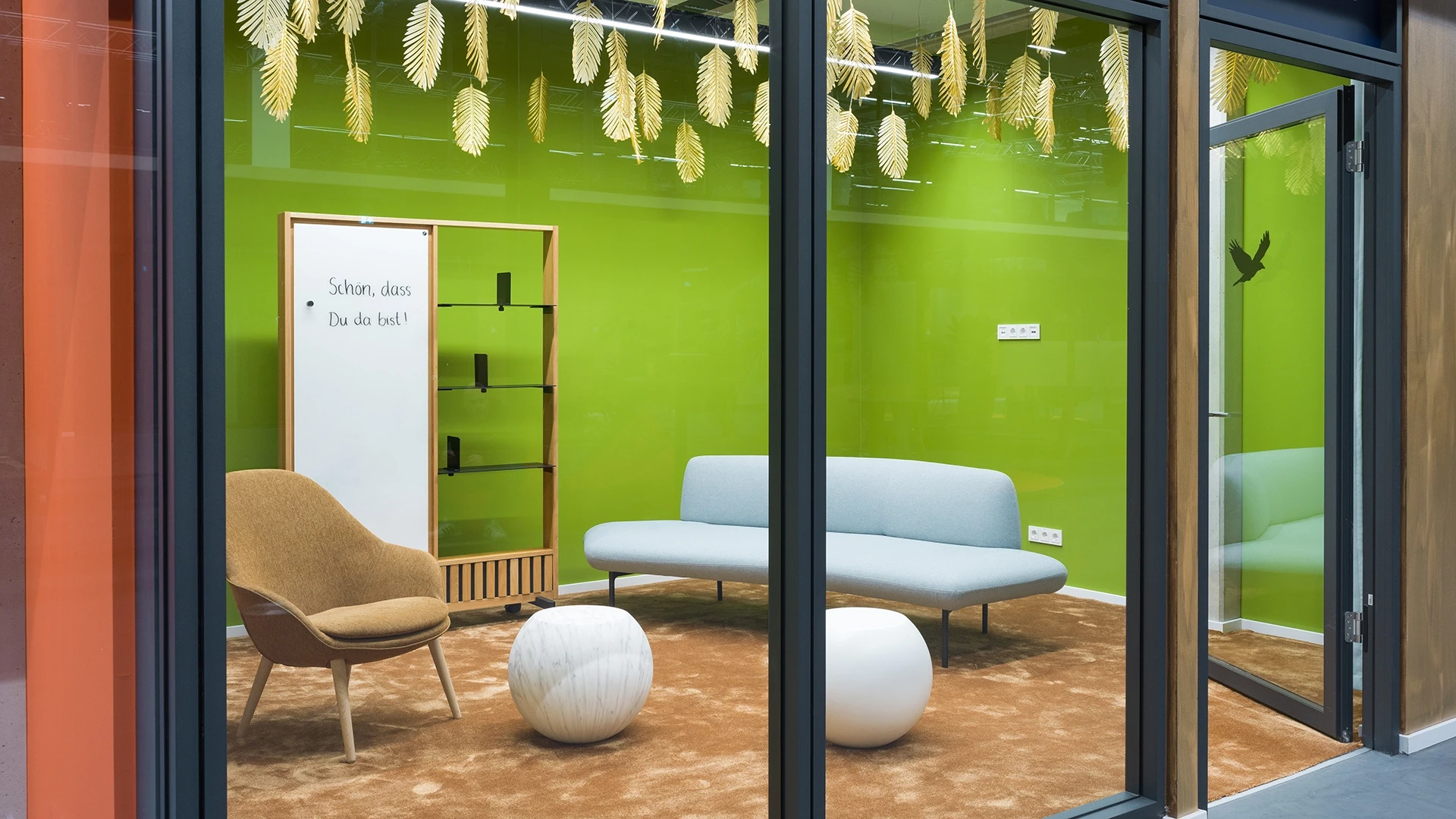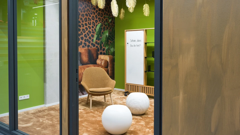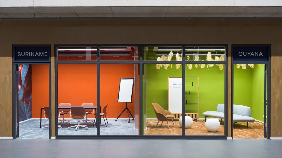 Guyana vereint auf geräumigen 18m² grüne Wände mit einer eindrucksvollen Leoparden-Tapete. Der goldbraune hochflurige Teppich und die bodentiefen Fenster zum Amazonas schaffen eine perfekte Balance zwischen Naturverbundenheit und professioneller Meetingatmosphäre. Ideal für Deine konzentrierten Kleingruppensessions und für eine kurze Pause ist das Smart Café nicht weit.